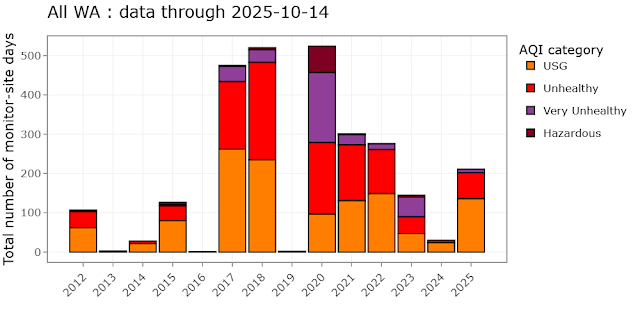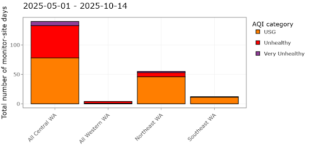 Conditions changed quickly at the end of August. A combination of lightning-sparked wildfires, hot and dry weather, and light winds caused unhealthy air quality days across Central and Eastern Washington. Overall, the 2025 season ended up resembling 2021 and 2022 more than the relatively smoke-free 2024. Days with air quality in the categories of unhealthy for sensitive groups (USG) or worse, as reported by air quality monitors