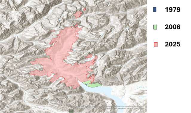 The 2025 perimeter of the Bear Gulch Fire (pink, center) compared to previous fires in 2006 (blue, lower left) and 1979 (green, small area between the 2025 and 2006 fire areas)